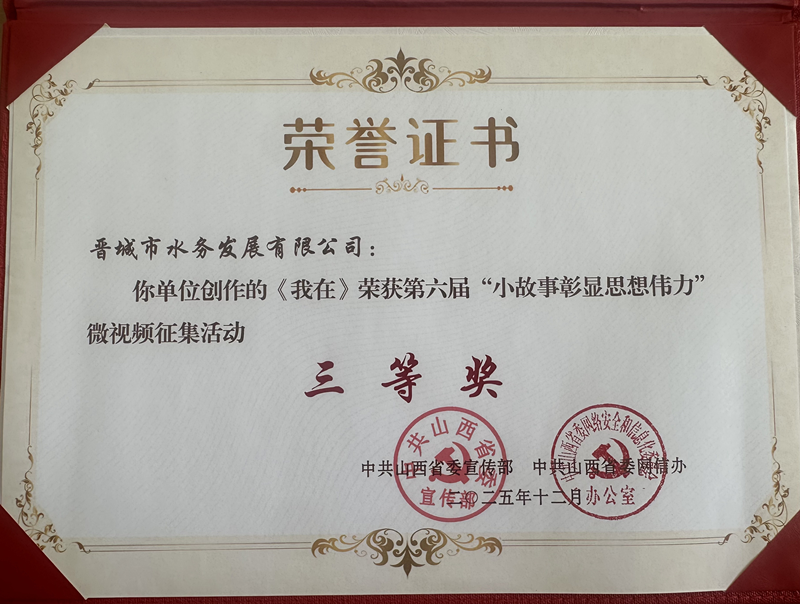 2025年10月,晉城市水務(wù)發(fā)展有限公司參加由中共山西省委宣傳部、中共山西省委網(wǎng)信辦聯(lián)合舉辦的第六屆山西省“小故事彰顯思想偉力”微視頻征集活動(dòng),作品《我在》榮獲三等獎(jiǎng)。